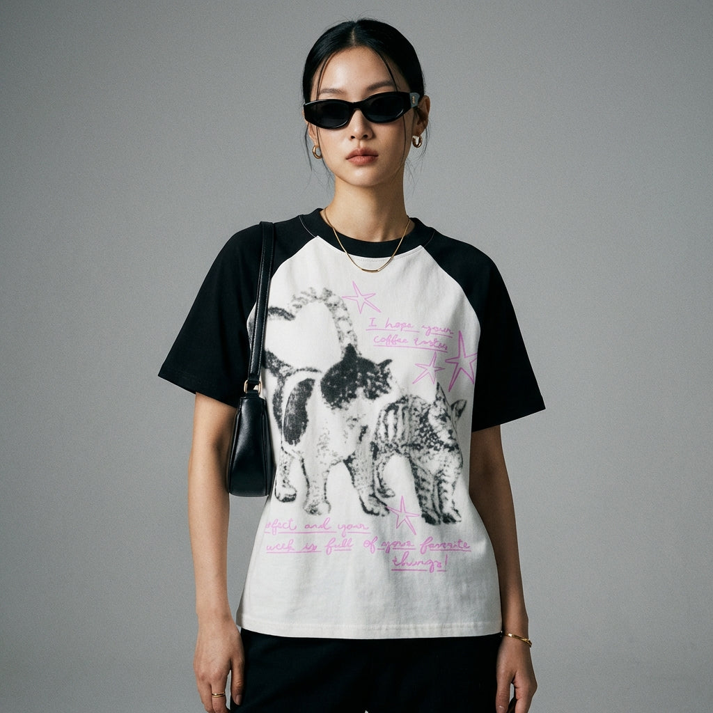 T-shirt court blanc imprimé chat rétro, mode K-fashion femme