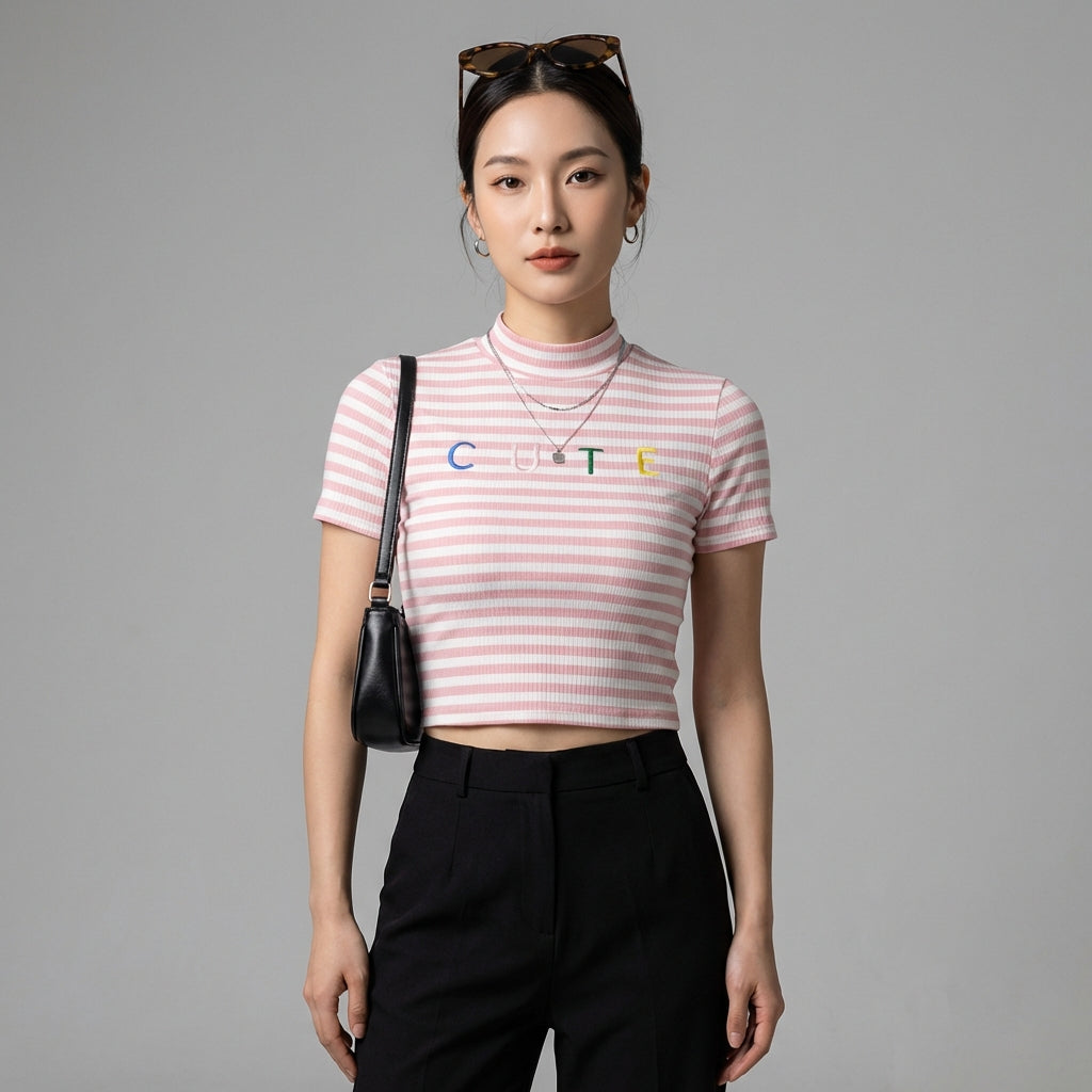 Afirma tu estilo con nuestra camiseta corta de rayas, con un elegante cuello alto y un corte ajustado. ¡Este modelo es perfecto para un look atrevido y a la moda, ideal para cualquier ocasión! 💖