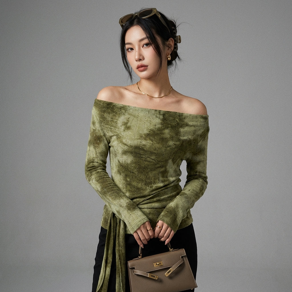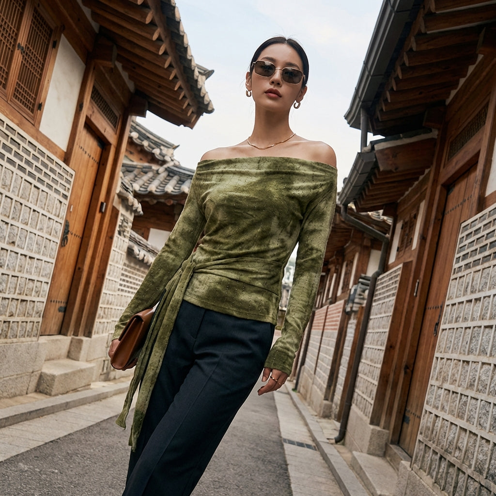 T-shirt vert épaule dénudée manches longues - Mode K-fashion