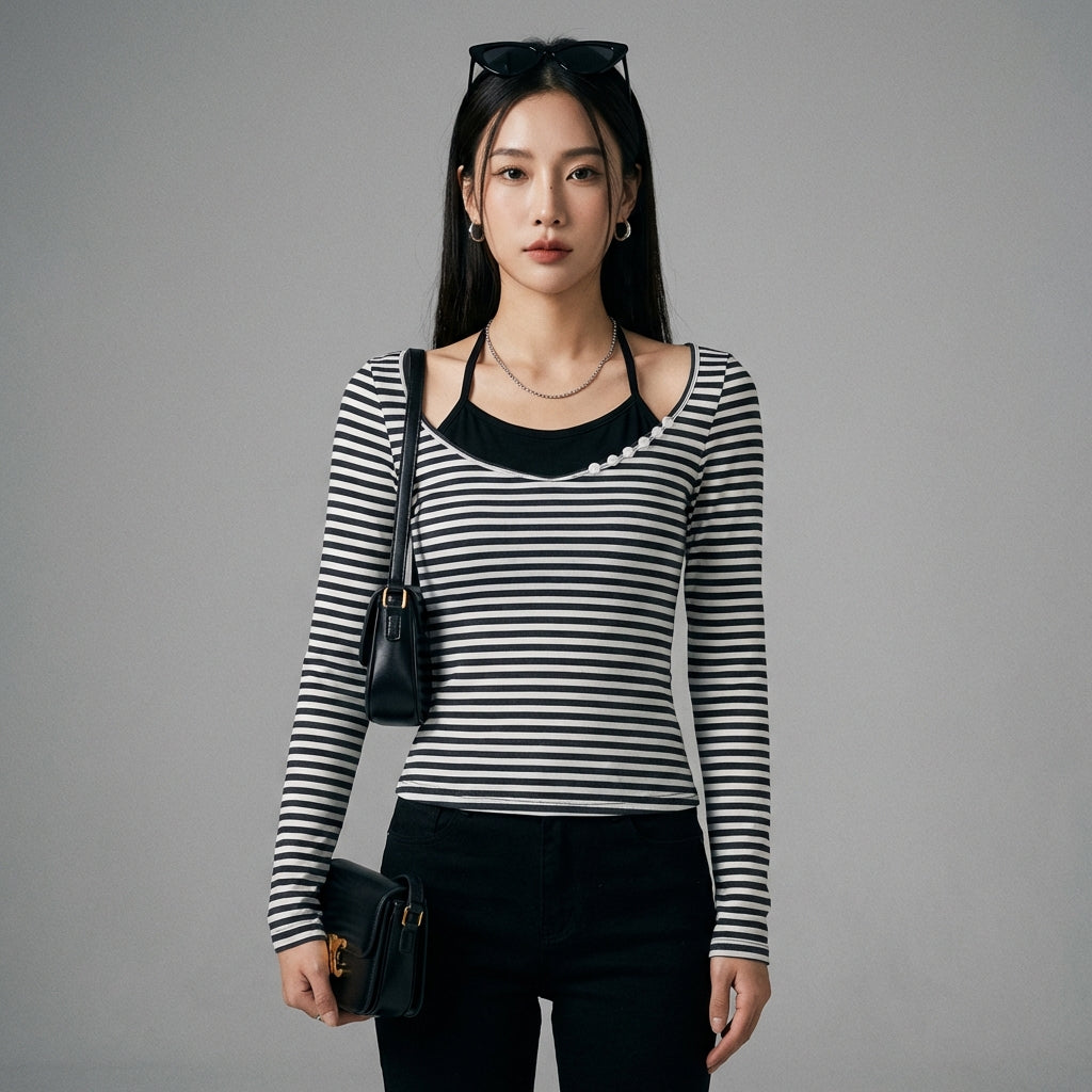 Adopta un look atrevido y a la moda con nuestra camiseta de punto de manga larga. Su diseño de "falso dos piezas" y su cuello en U realzan una silueta ajustada, ¡perfecta para un estilo seguro y moderno! ✨