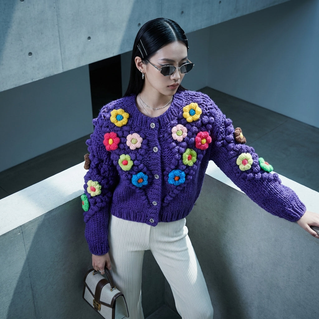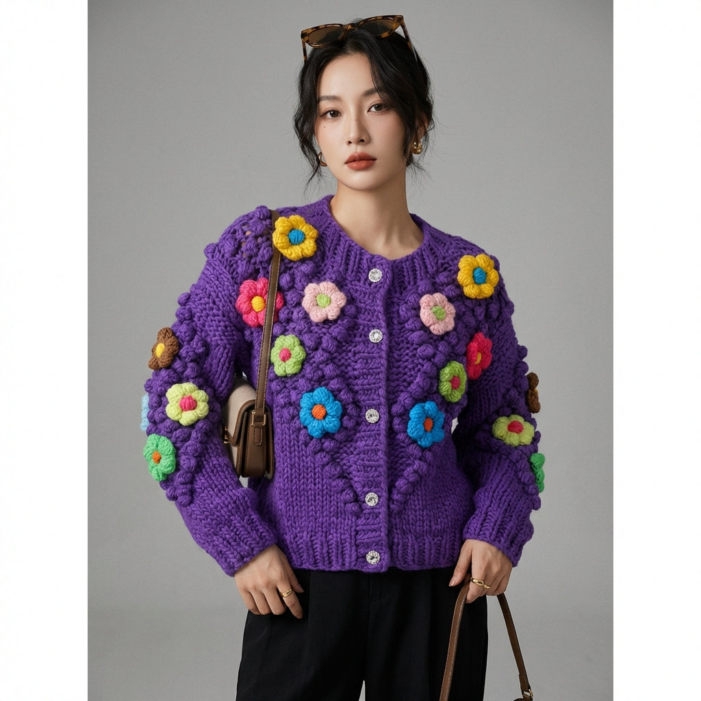 Adopta un look suave y femenino con nuestro cárdigan de lana tejido, realzado con delicadas flores. Su cuello redondo y sus mangas largas lo convierten en una prenda perfecta para mantenerte elegante y cómoda en cualquier ocasión. 🌸