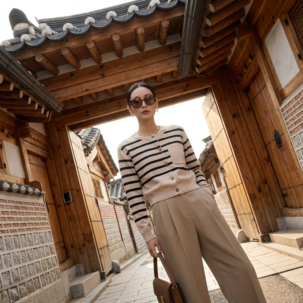 Este cárdigan a rayas es la pieza ideal para un look fresco y moderno, perfecto para quienes les gusta combinar comodidad y estilo inspirado en la moda coreana.