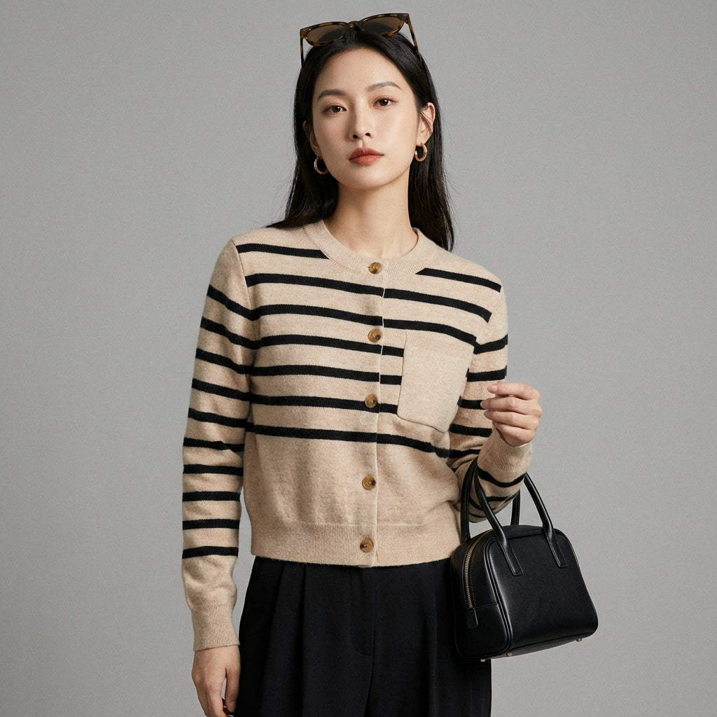 Adopta un estilo preppy y a la moda con nuestro cárdigan corto de cuello redondo y rayas. Perfecto para añadir un toque de sofisticación informal a tus atuendos. Su diseño de un solo botón ofrece un aspecto moderno y chic, ¡ideal para todas las ocasiones! ✨