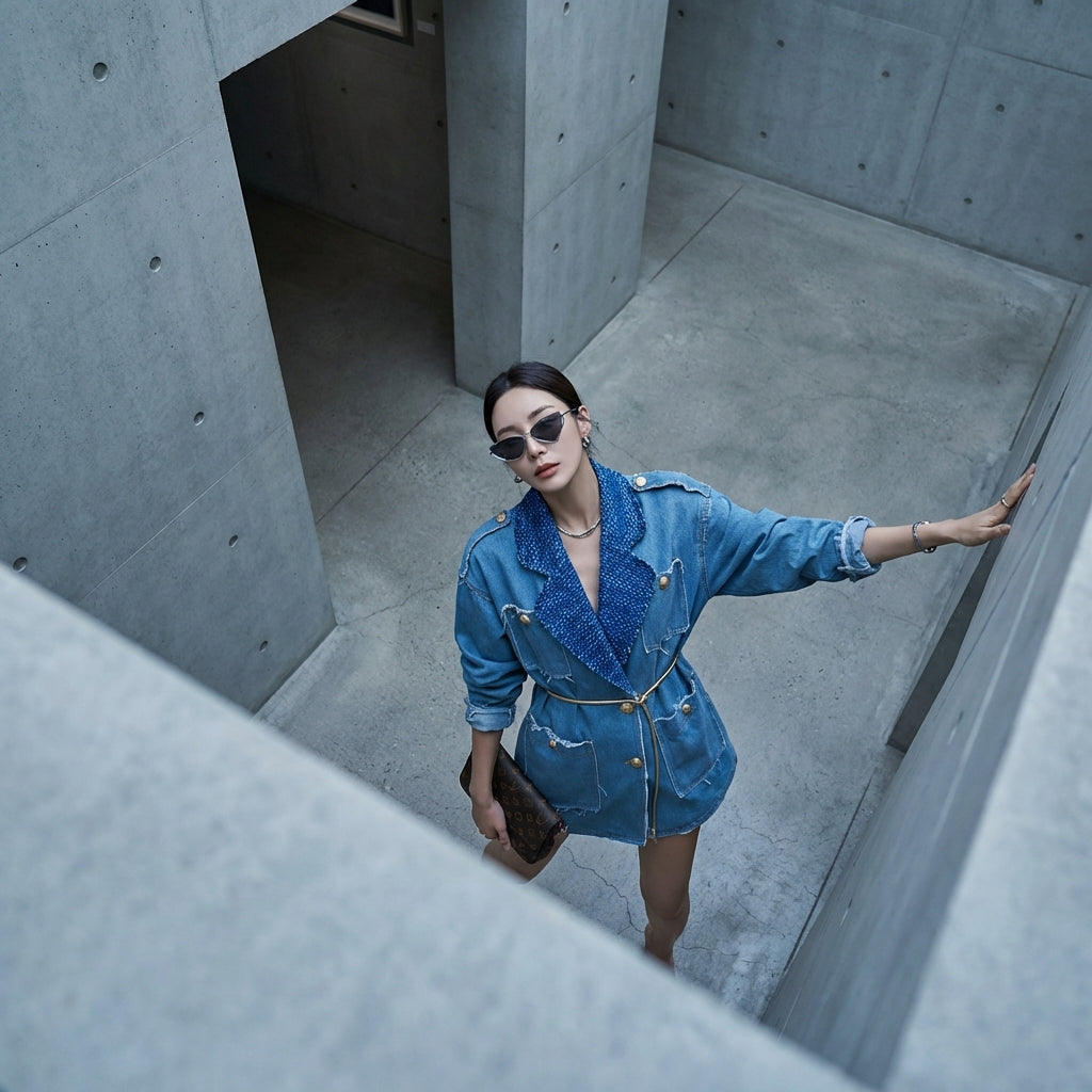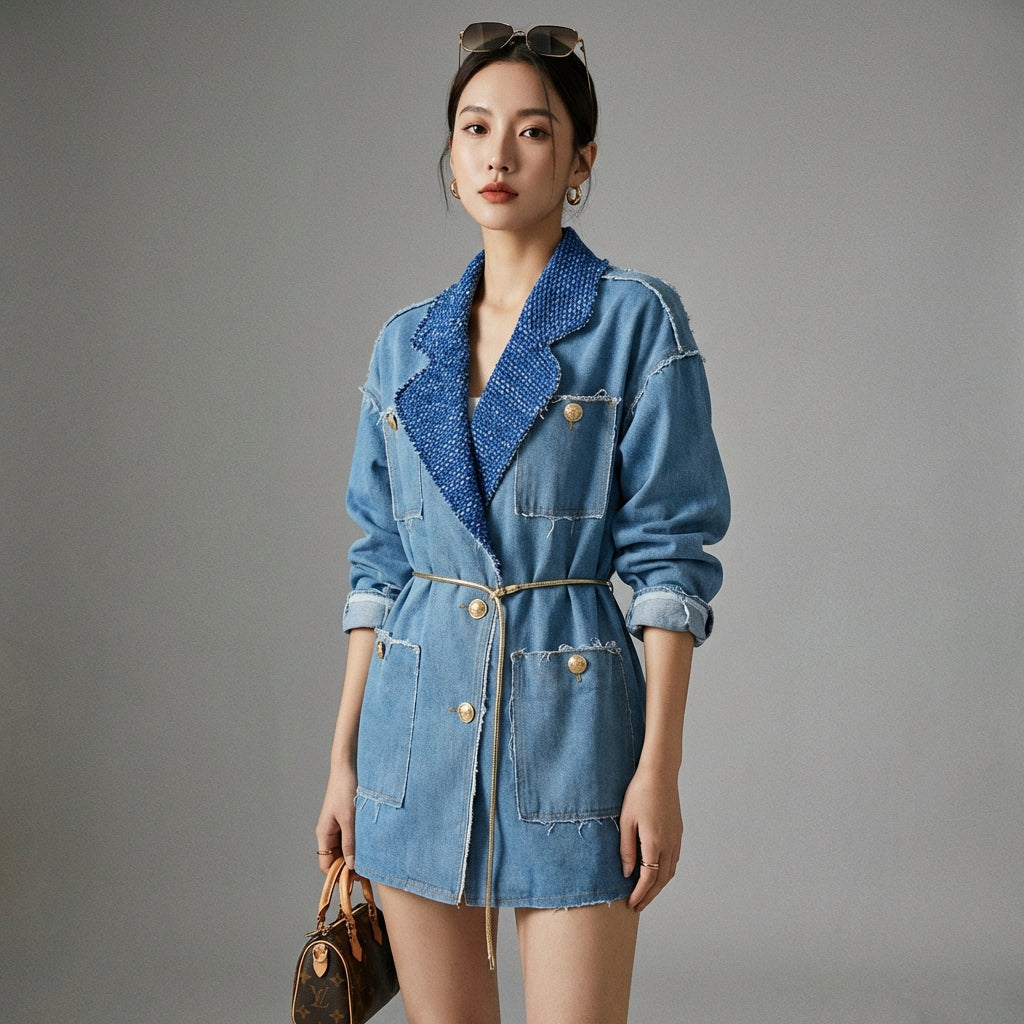 Este blazer de denim bicolor es la prenda perfecta para realzar tu guardarropa con un toque de estilo coreano contemporáneo, combinando comodidad y elegancia casual.