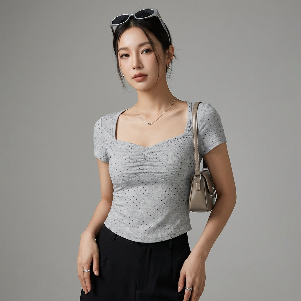 Adopta un look chic y moderno con nuestra camiseta corta de lunares, con un elegante cuello cuadrado. Su corte ajustado realzará tu figura, mientras que los detalles plisados añaden un toque de feminidad. ¡Perfecta para un estilo moderno y seductor! ✨