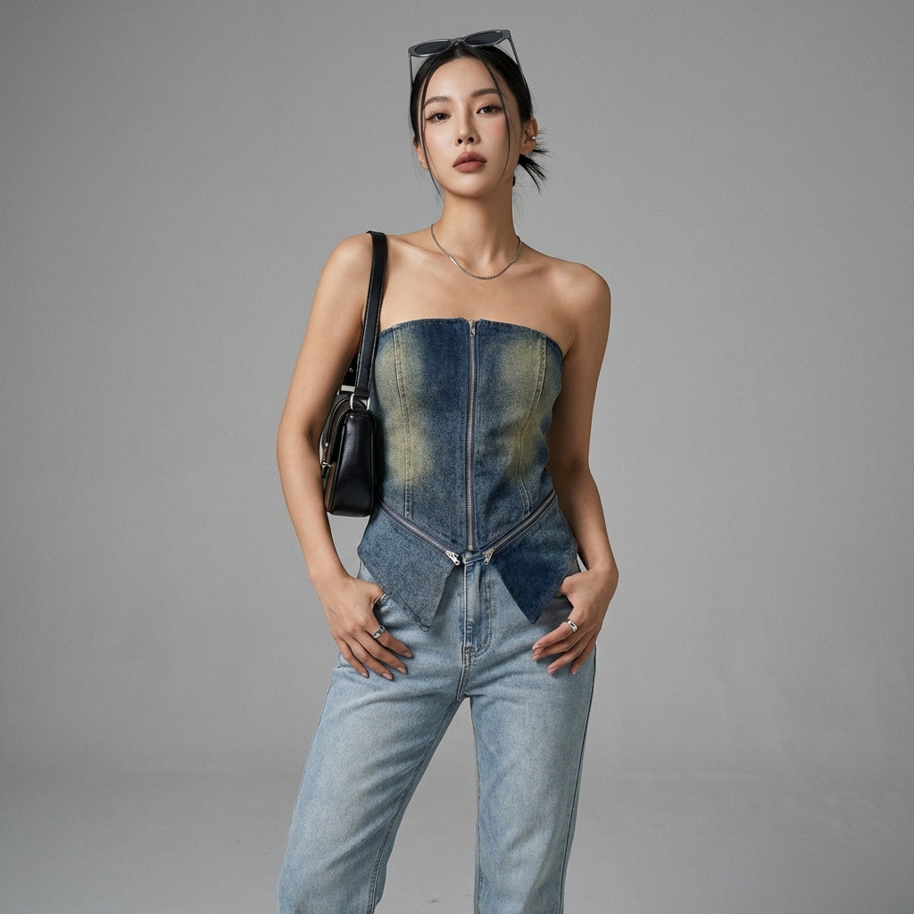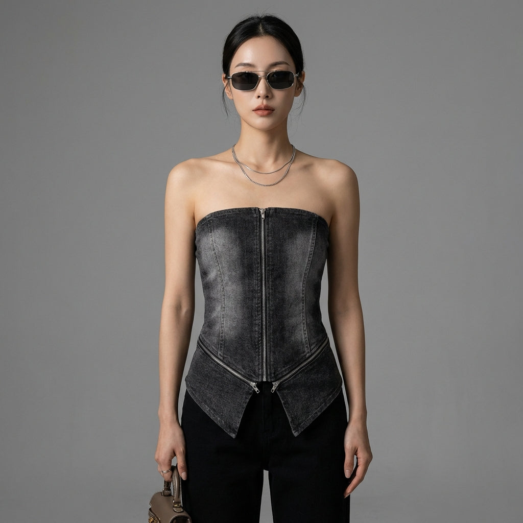 Afirma tu estilo con nuestro top bustier de mezclilla deslavada, con una cremallera asimétrica para un toque de originalidad. Diseñado con almohadillas integradas, asegura una sujeción y comodidad perfectas. ¡Un imprescindible para un look audaz y a la moda! ✨