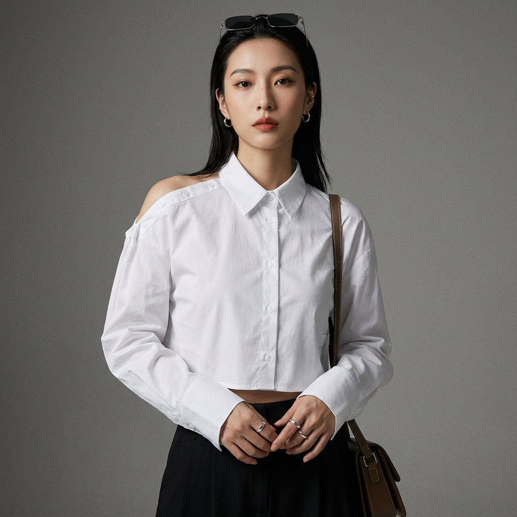 Elige esta blusa de hombros descubiertos y añade un toque de audacia y sofisticación a tu armario, manteniéndote a la vanguardia de la moda coreana.