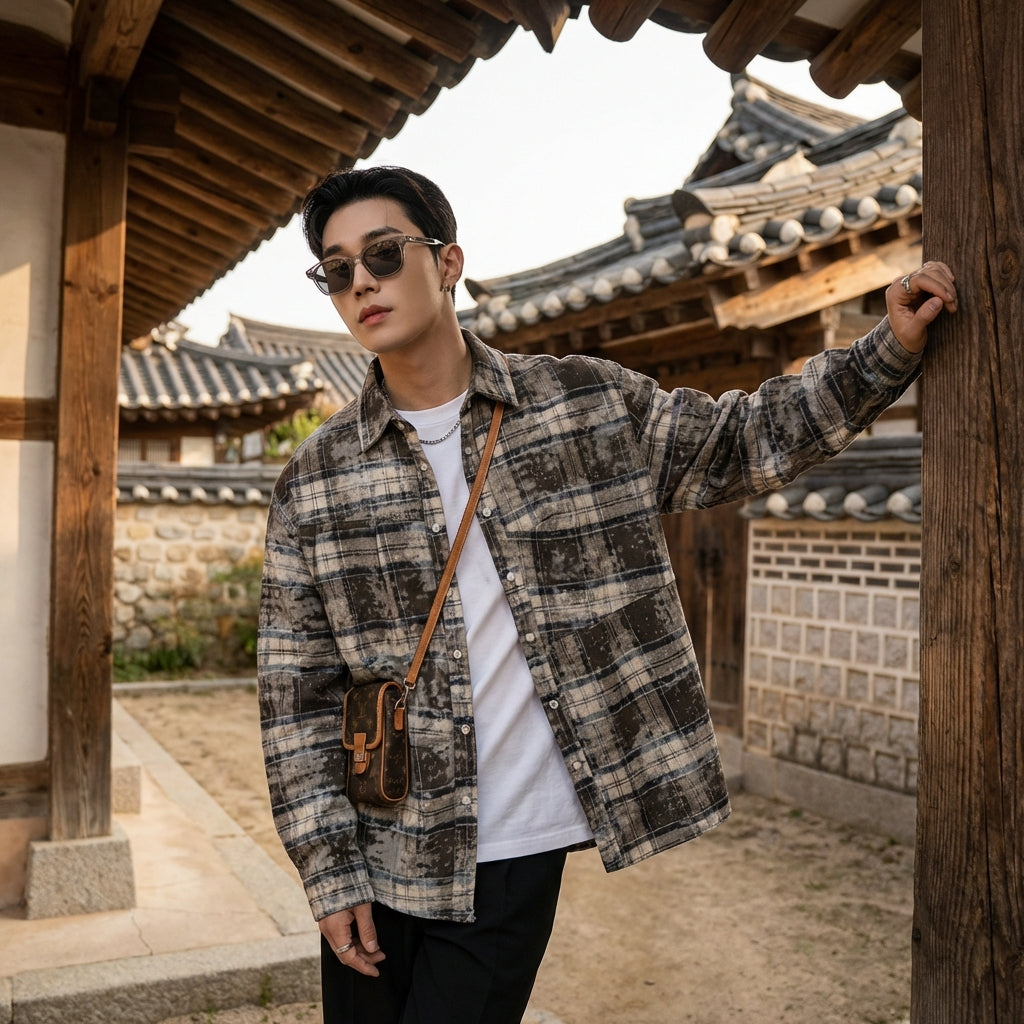 - Estilo: Streetwear, Casual, Moda Coreana. Esta camisa encarna el espíritu relajado y moderno del streetwear coreano, ideal para un look urbano y actual.