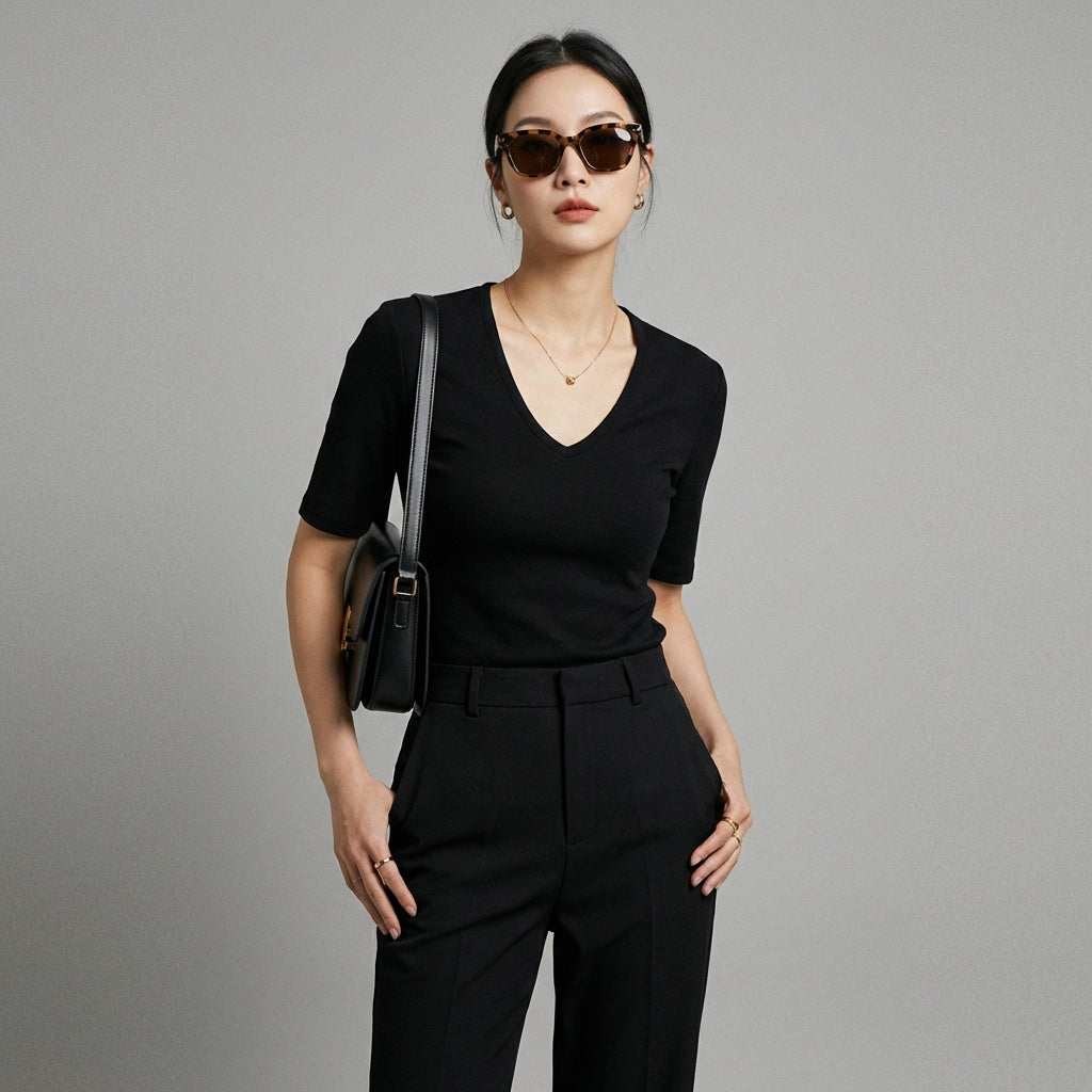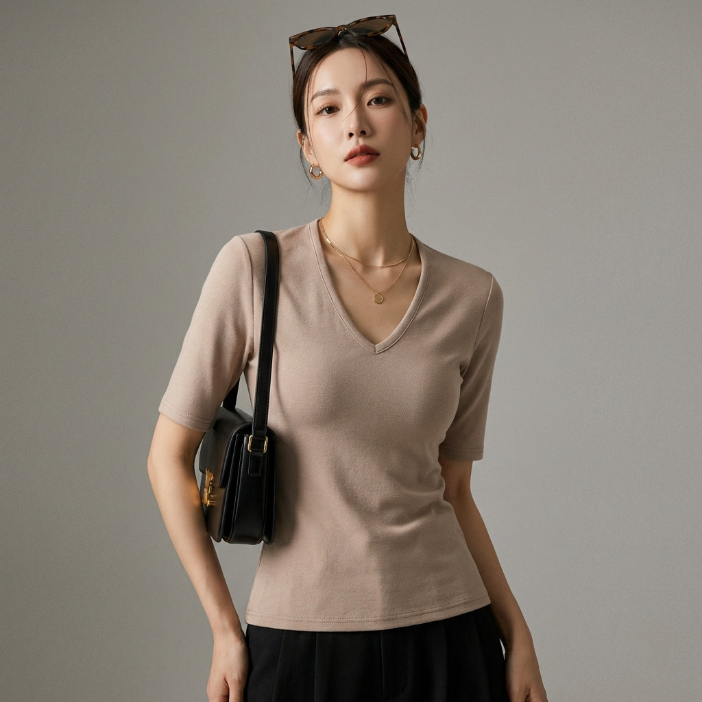 Adopta un look chic y depurado con nuestra camiseta ajustada de cuello en V y manga corta. Ideal para realzar tu figura, ¡combina estilo y comodidad para todas tus ocasiones! ✨