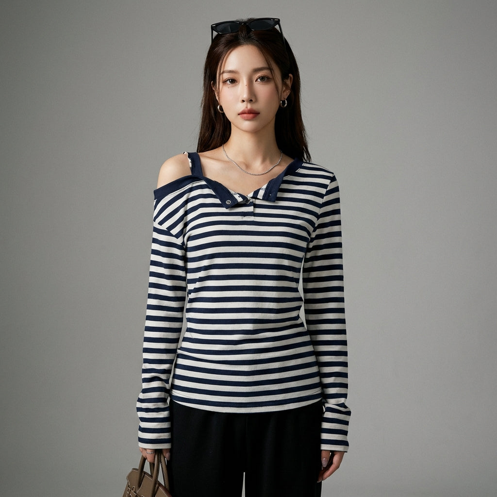 Elige esta camiseta asimétrica a rayas y añade un toque de originalidad y elegancia coreana a tu armario.