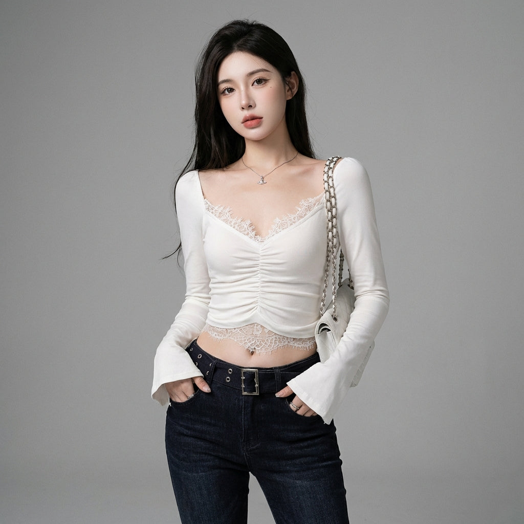 Descubre nuestra elegante camiseta con cuello en V y mangas acampanadas, una prenda imprescindible para un look refinado y a la moda. ¡Su corte ajustado realzará tu figura con sutileza! ✨