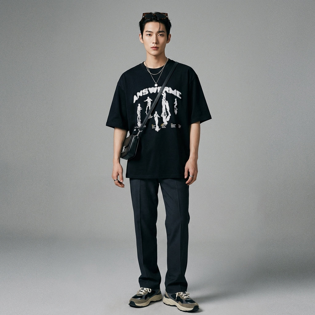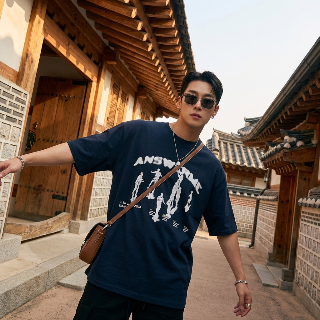 - Estilo: Streetwear, K-fashion, Urbano. Esta camiseta encarna la esencia del estilo streetwear coreano, con un toque de modernidad para un look sin esfuerzo.
