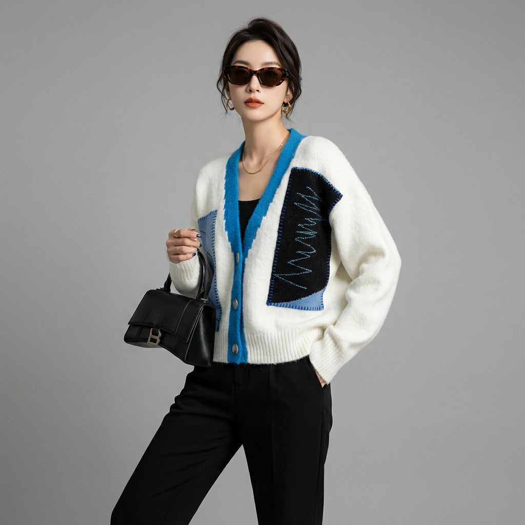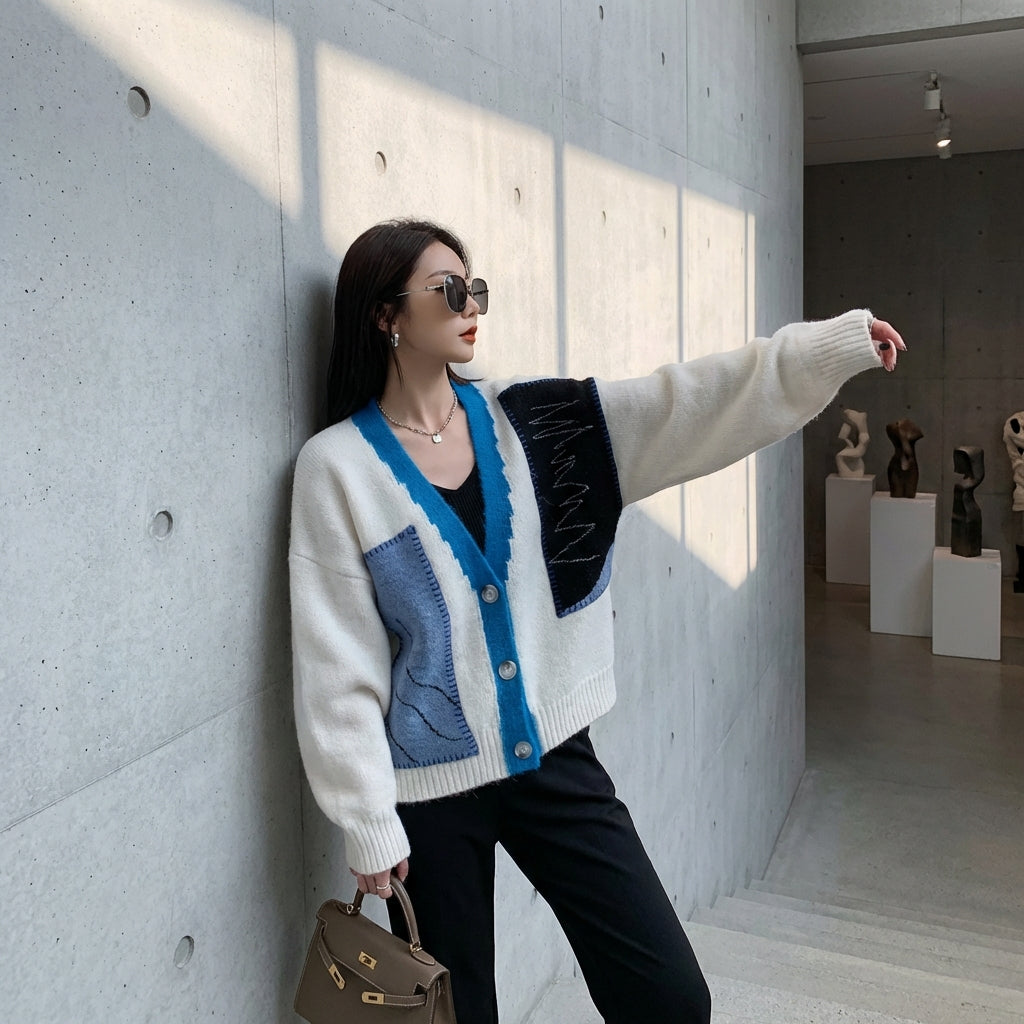 Cardigan tricoté femme col V ample bleu et blanc - Koreanxwear
