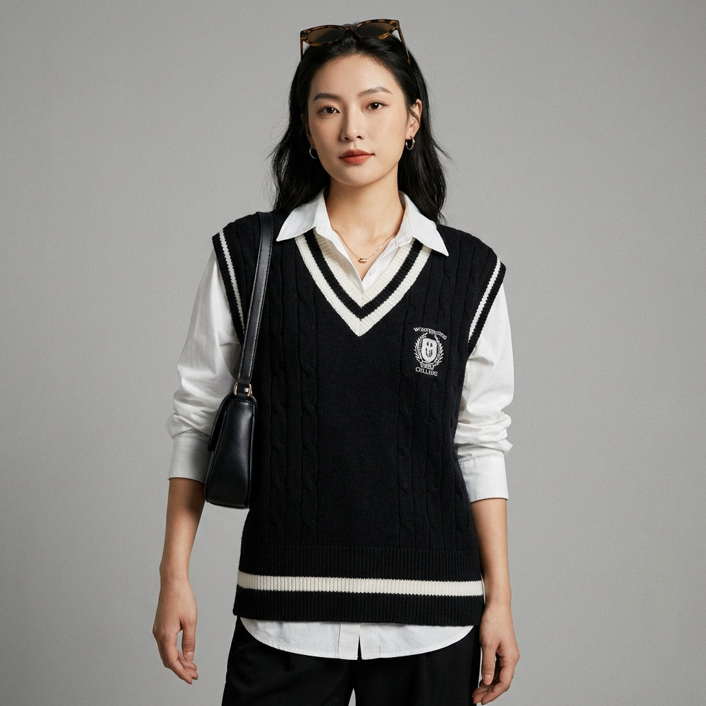 Gilet pull bicolore noir et blanc col V style universitaire - Koreanxwear