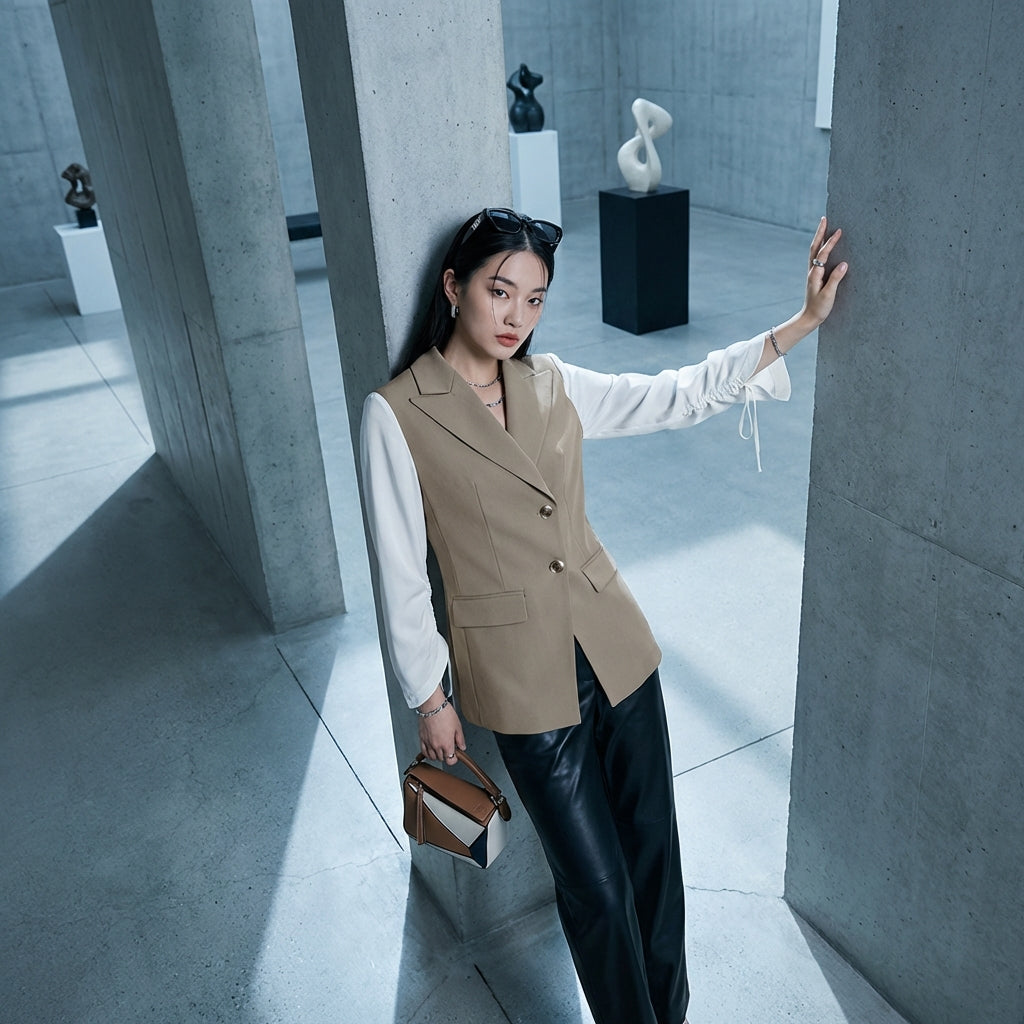 Esta chaqueta de traje bicolor es la elección perfecta para quienes buscan una prenda versátil, capaz de transformar cualquier atuendo en un conjunto elegante y contemporáneo, con un toque de inspiración coreana.