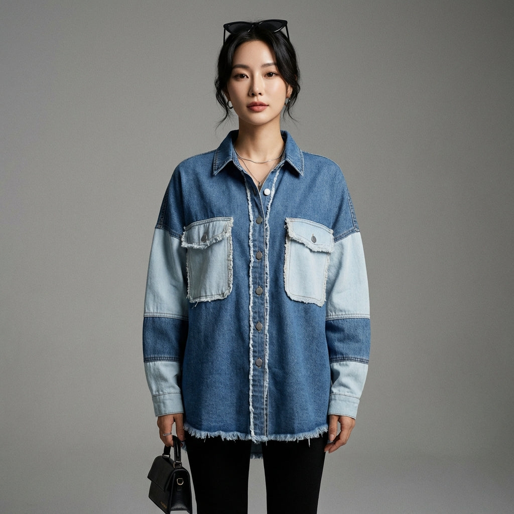 Adopta un look moderno y casual con nuestra chaqueta de mezclilla color block, con un dobladillo sin rematar para un toque de originalidad. ¡Esta chaqueta oversize de manga larga y cuello con solapa es perfecta para realzar tu estilo diario con un aire moderno y K-fashion! ✨