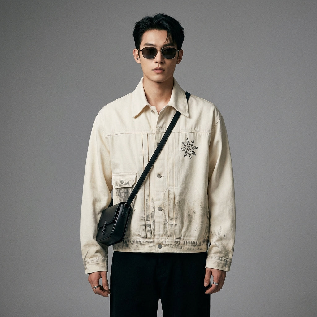 Afirma tu estilo con nuestra chaqueta de mezclilla estampada, un imprescindible para un look streetwear audaz. Su diseño holgado y sus detalles envejecidos aportan un toque vintage y moderno, ¡perfecto para expresar tu personalidad! 🎤