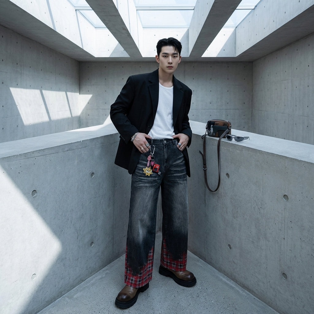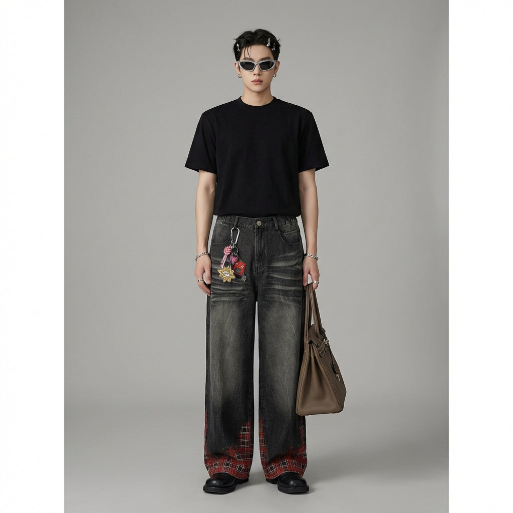 Afirma tu estilo con nuestros pantalones anchos de mezclilla, realzados con un distintivo estampado a cuadros y una cadena decorativa. Inspirados en la moda urbana, estos jeans ofrecen un corte relajado y una comodidad óptima para un look audaz y a la moda. ✨