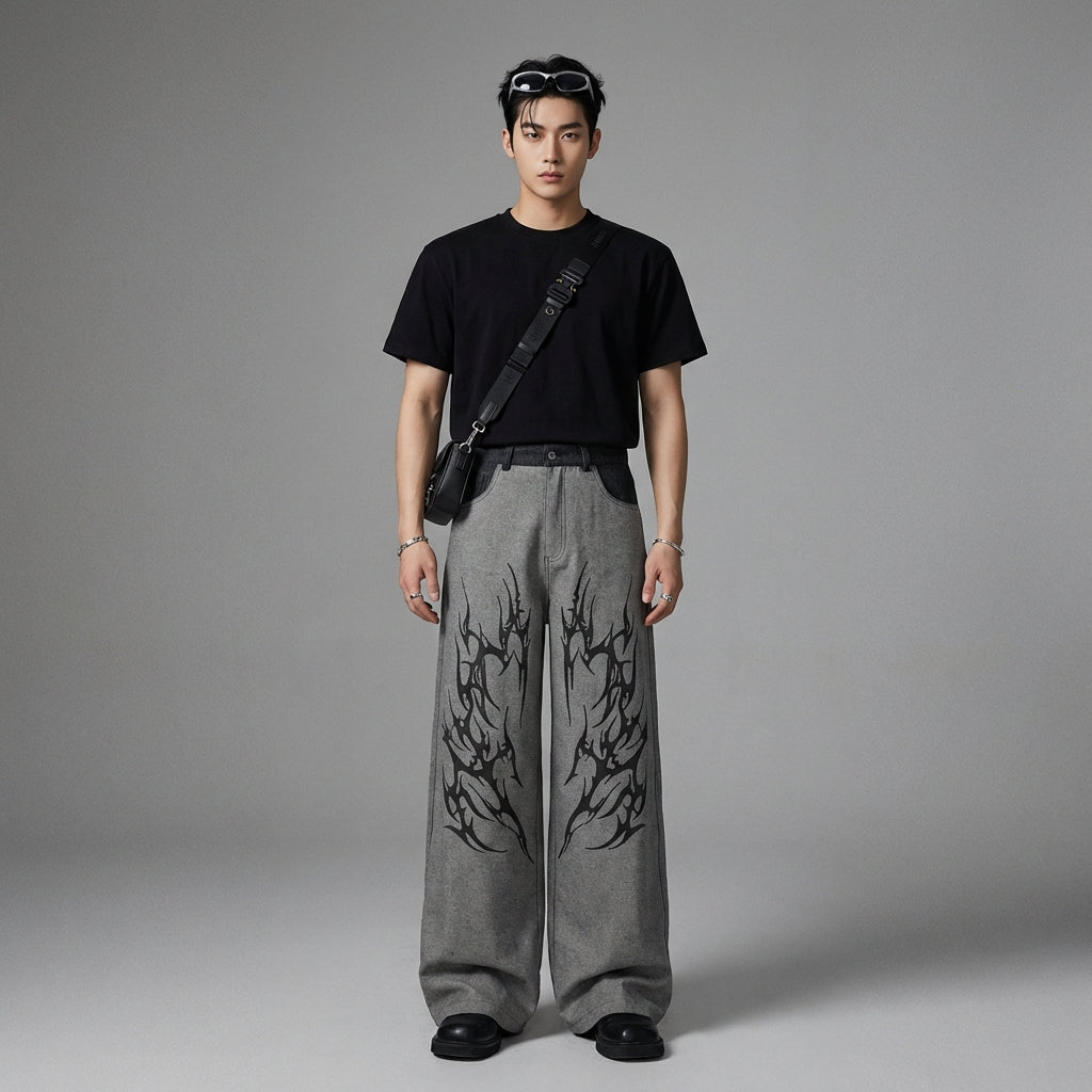 Afirma tu estilo único con estos pantalones cargo de mezclilla estampados, diseñados para un look casual y moderno. Su corte ancho y tiro medio garantizan una comodidad óptima y libertad de movimiento, perfectos para tus looks streetwear. ¡El estampado "espinas" añade un toque de originalidad para destacar con audacia! 🖤