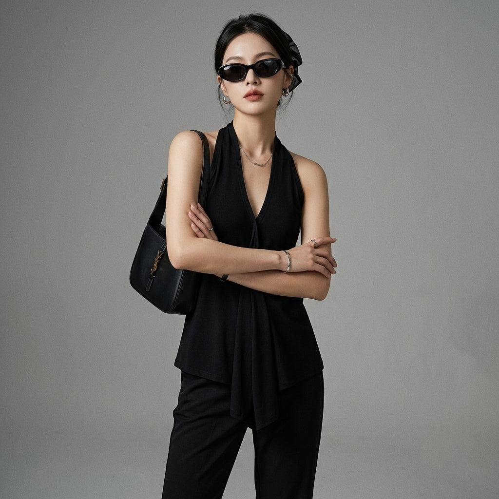 Top halter asymétrique col V dos nu noir - Mode Coréenne Koreanxwear