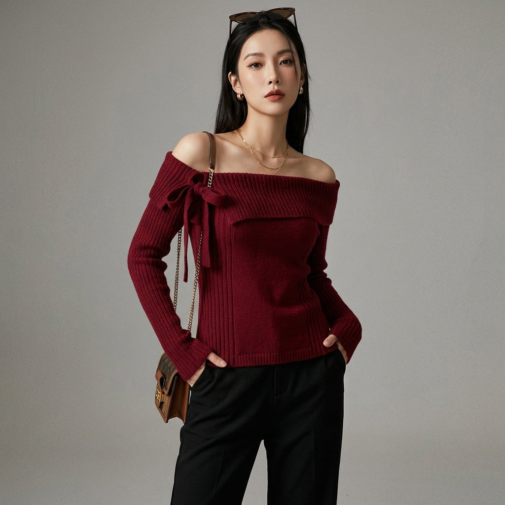 Pull asymétrique une épaule avec nœud, couleur unie - Koreanxwear