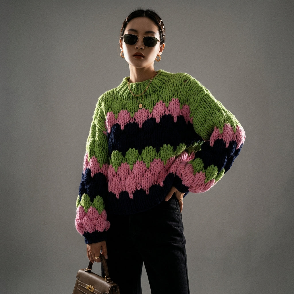 - Estilo: Streetwear, Tendencia, K-fashion. Este jersey encarna el espíritu casual y colorido de la moda coreana, perfecto para un look atrevido.