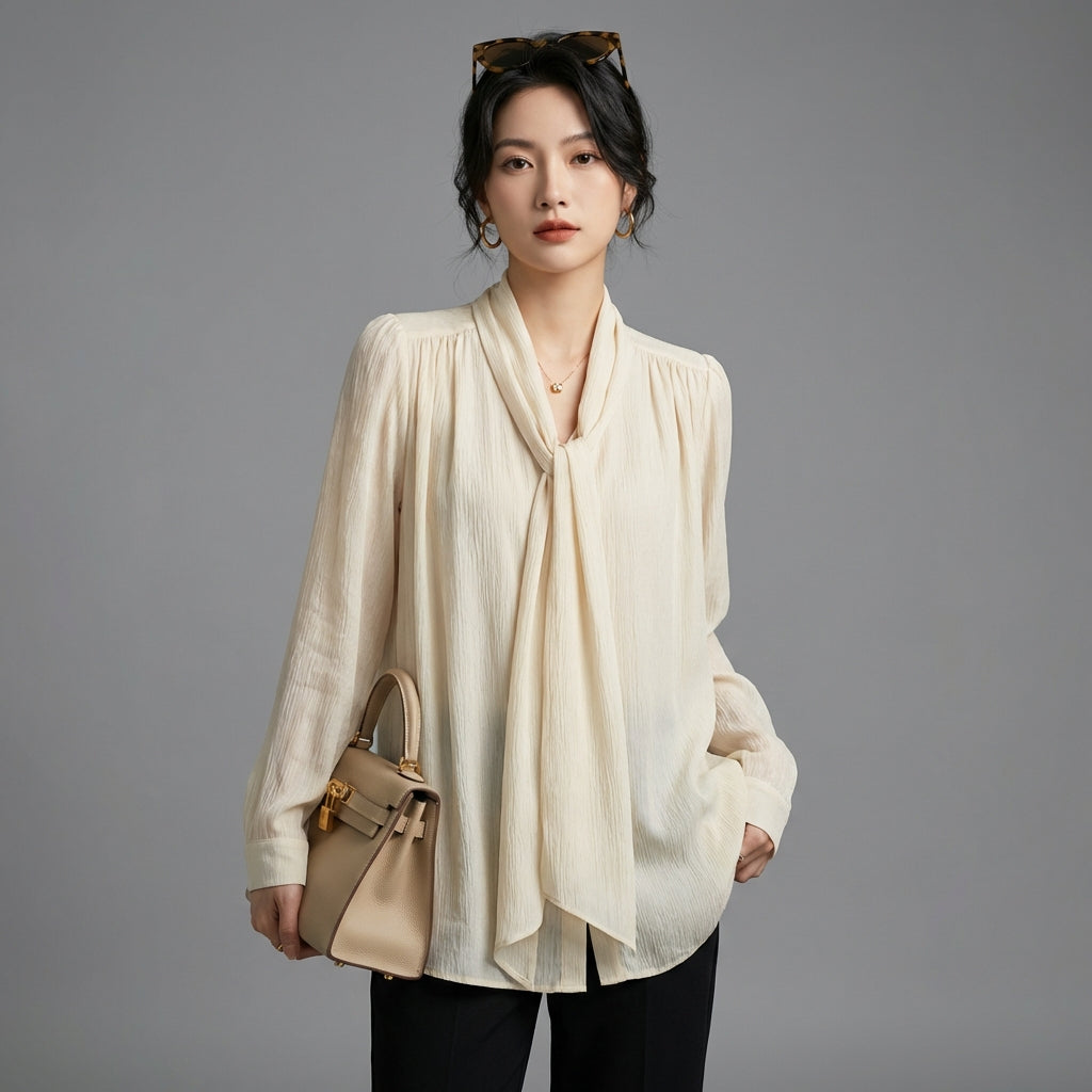 Adopta un estilo elegante y casual con nuestra blusa fluida, con un delicado cuello lavallière y mangas largas. Su corte holgado y sus detalles plisados ofrecen una silueta versátil y moderna, ¡perfecta para todas las ocasiones! 🌸