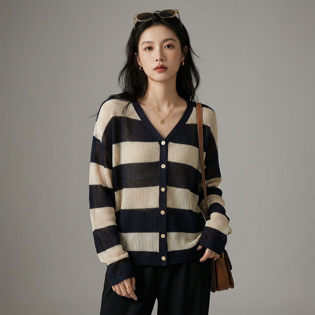 Adopta un look casual y chic con nuestro cárdigan de punto a rayas, con un elegante cuello en V y un corte holgado. Ideal para superponer y añadir un toque de estilo a tus conjuntos. ¡Perfecto para una comodidad acogedora y un aspecto moderno! ✨