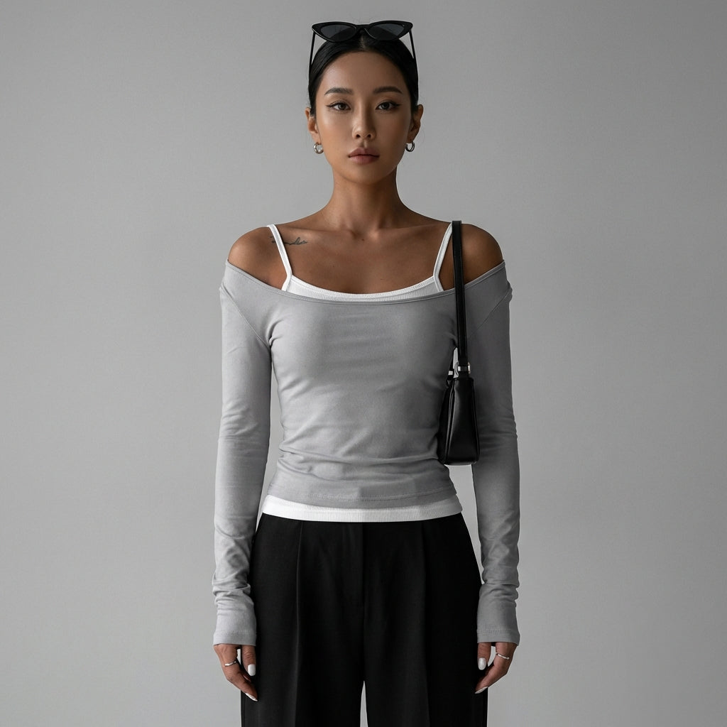 Adopta un look moderno y atrevido con nuestro conjunto de dos piezas slim, compuesto por un top con hombros descubiertos y una camiseta de manga larga. ¡Perfecto para una silueta moderna y casual! ✨