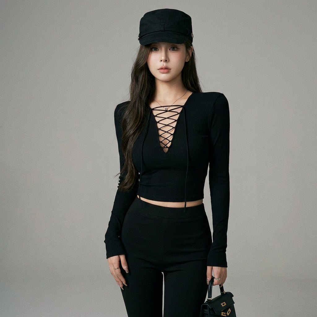 Afirma tu estilo con nuestro crop top negro, con un favorecedor escote en V y mangas largas para un look moderno y elegante. Su corte ajustado realza la silueta, ¡perfecto para un look atrevido y a la moda! 🖤
