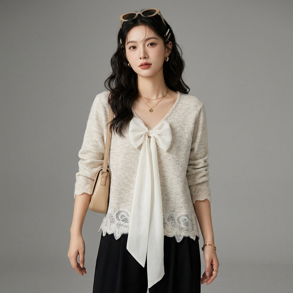 Adopta un estilo suave y refinado con nuestro suéter de punto, perfecto para cualquier ocasión. Su cuello en V está delicadamente realzado con bordes de encaje, añadiendo un toque de feminidad y elegancia a tu atuendo. Cómodo y elegante, ¡es la prenda ideal para un look casual o más sofisticado! ✨
