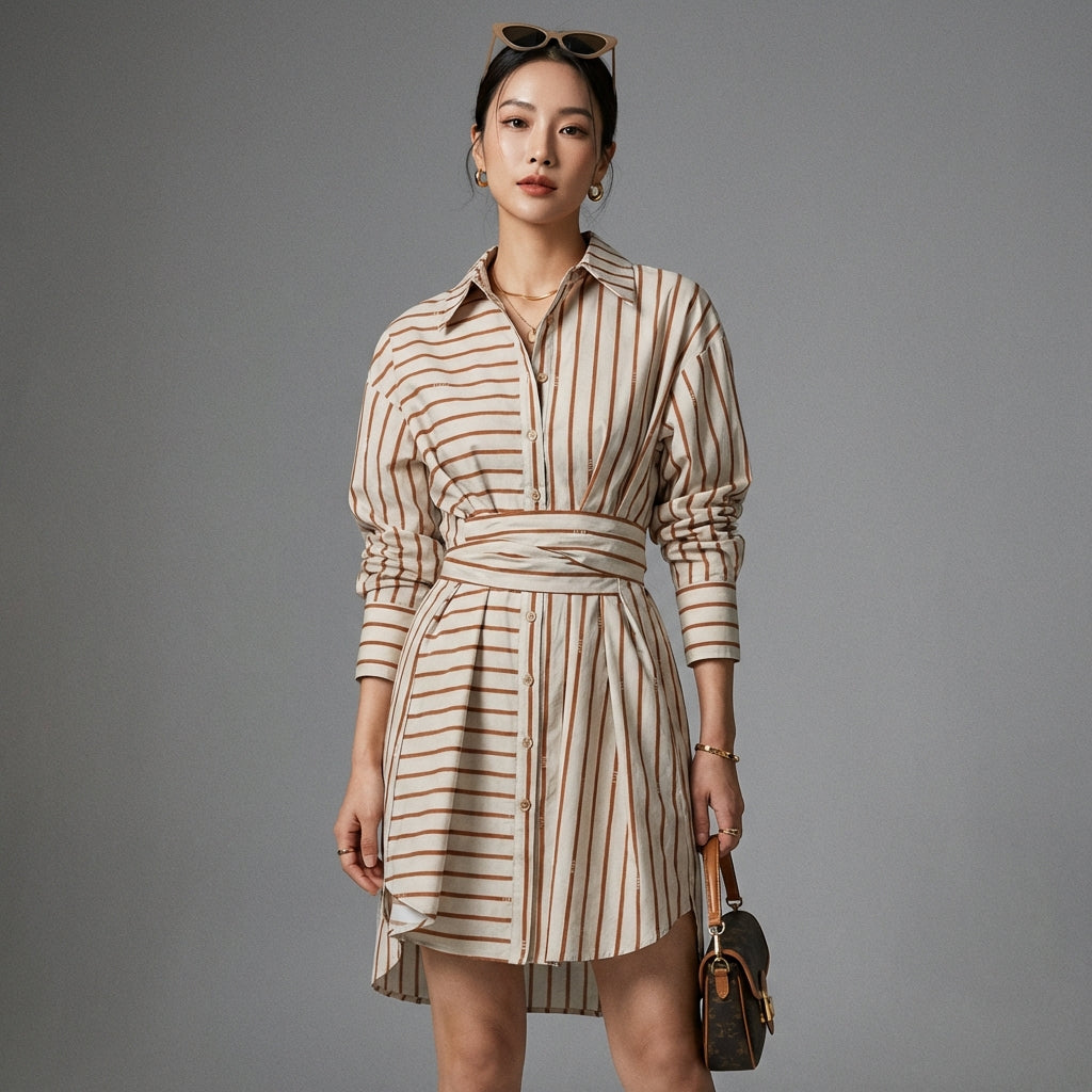Adopta un look atrevido y sofisticado con nuestro vestido camisero largo, caracterizado por sus rayas contrastantes y su diseño asimétrico. Con cuello de solapa y mangas largas, aporta un toque de modernidad a tu armario. ¡Perfecto para un estilo seguro y a la moda! ✨