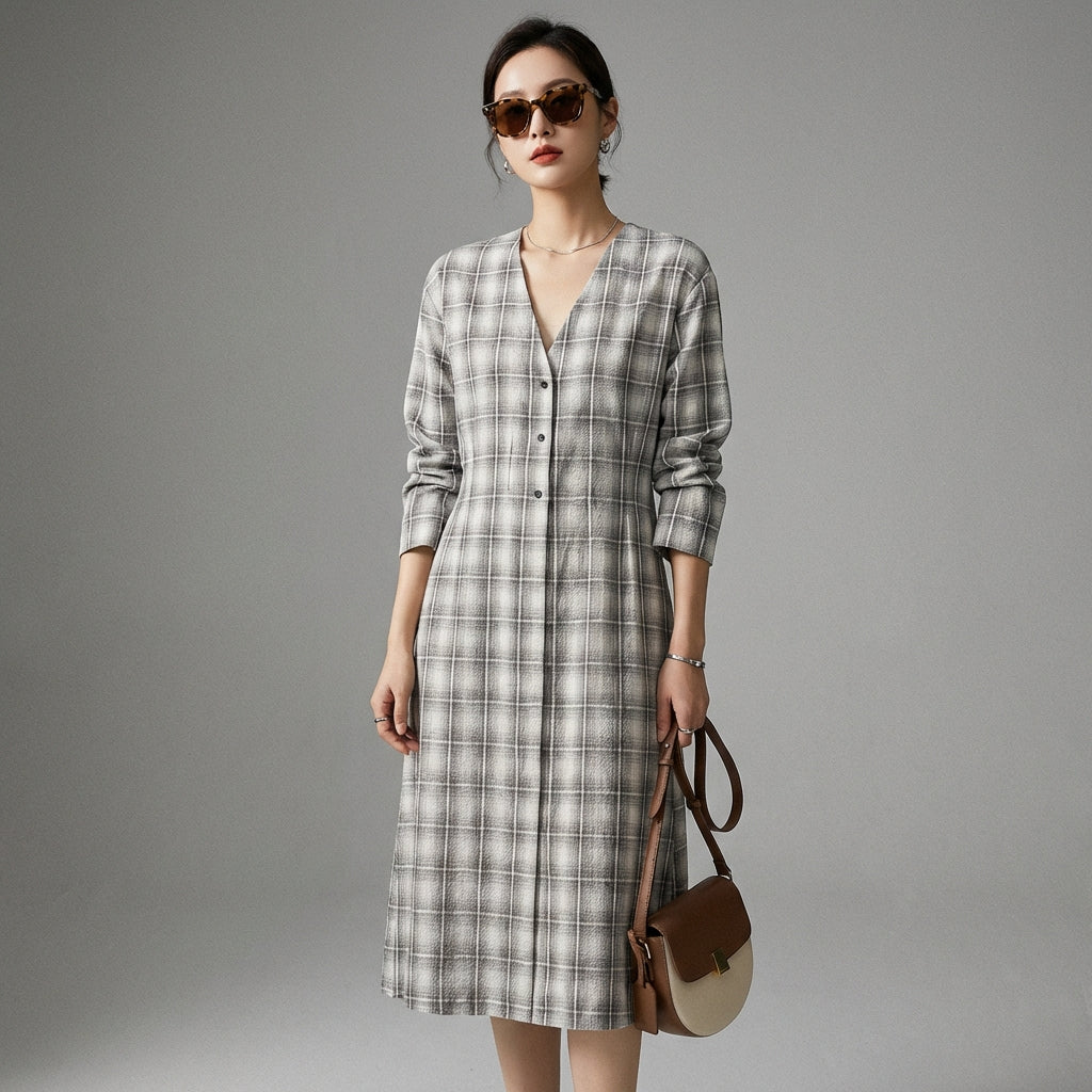 Adopta un look chic y atemporal con nuestro vestido largo a cuadros, con un elegante cuello en V y mangas largas. Su corte fluido y su estampado clásico lo convierten en una pieza clave para cualquier ocasión, ¡combinando comodidad y sofisticación! 👗