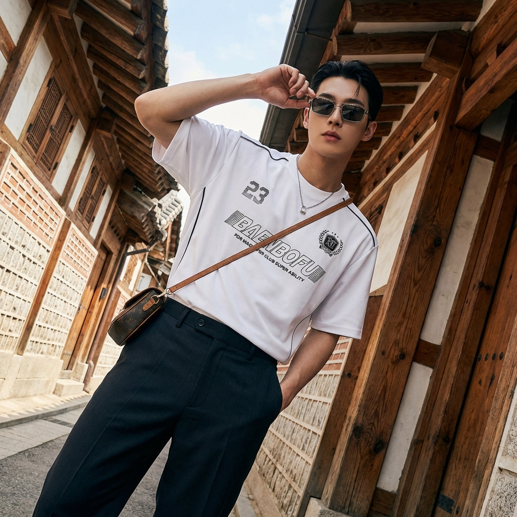 - Estilo: Streetwear, Casual, K-fashion. Esta camiseta encarna el espíritu de la moda urbana coreana, con un corte amplio y un diseño gráfico.