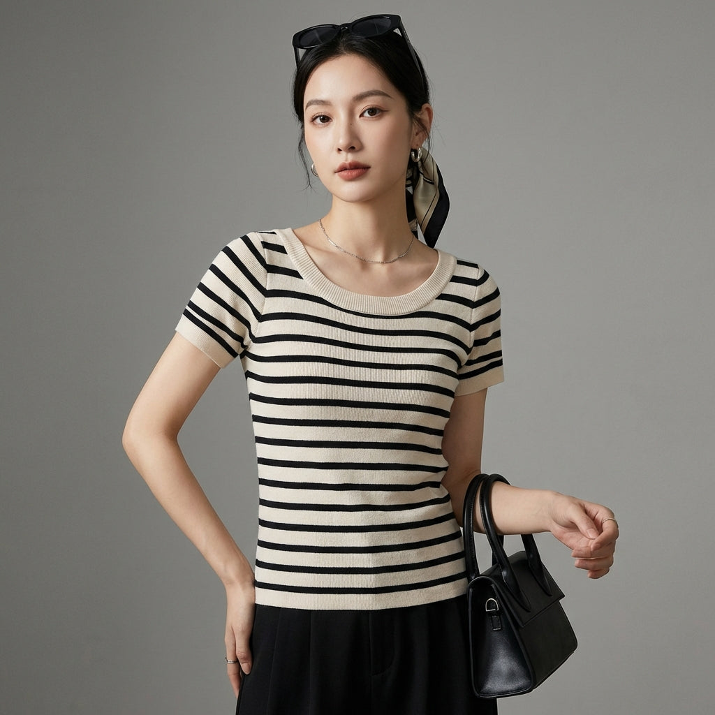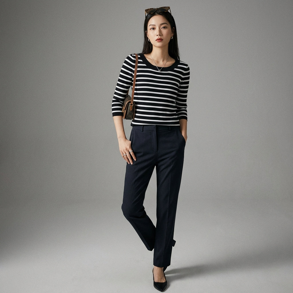 Adopta un look atemporal y elegante con nuestro jersey de rayas con cuello redondo. Su corte clásico y sus discretas rayas lo convierten en un imprescindible de cualquier armario, ¡perfecto para un toque de sofisticación en el día a día! ✨