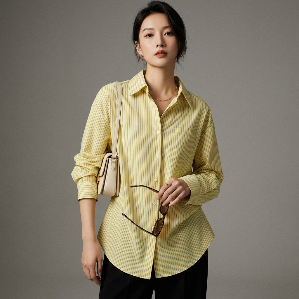 Con esta camisa de rayas, añade un toque de sofisticación casual a tu armario, inspirada en las últimas tendencias de la moda coreana.