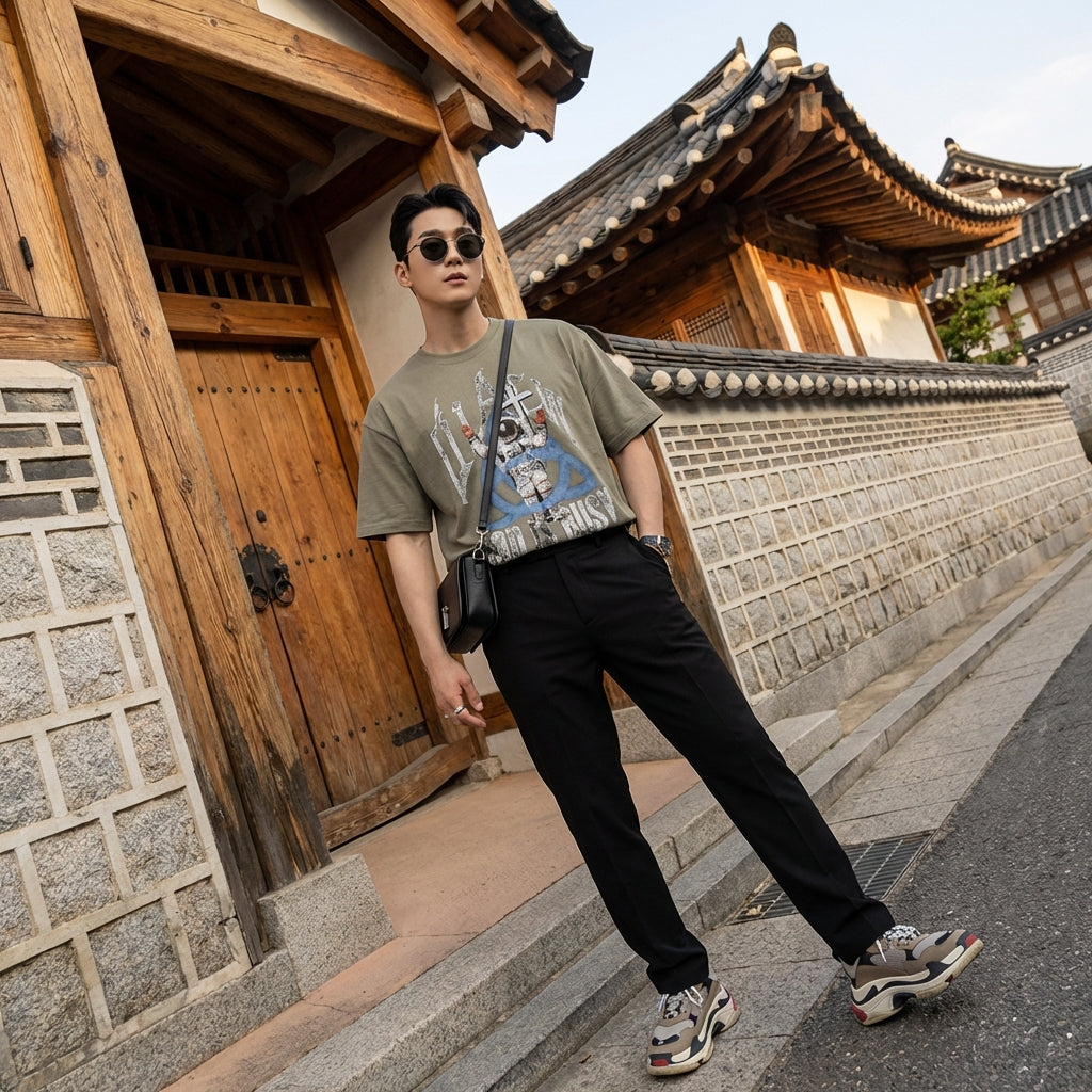 - Estilo: Streetwear, Urbano, Casual. Esta camiseta se inscribe perfectamente en la moda streetwear coreana, ofreciendo un look moderno y atrevido.