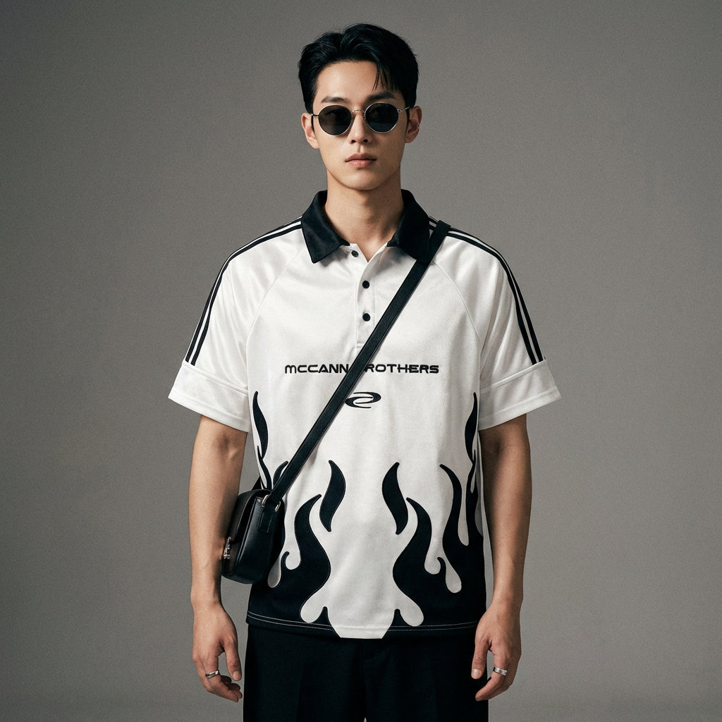 Afirma tu estilo con nuestro polo oversize de atrevido diseño de llamas. ¡Perfecto para un look streetwear casual y a la moda, esta camiseta de manga corta con cuello polo añade un toque de originalidad a tu armario de verano! 🔥