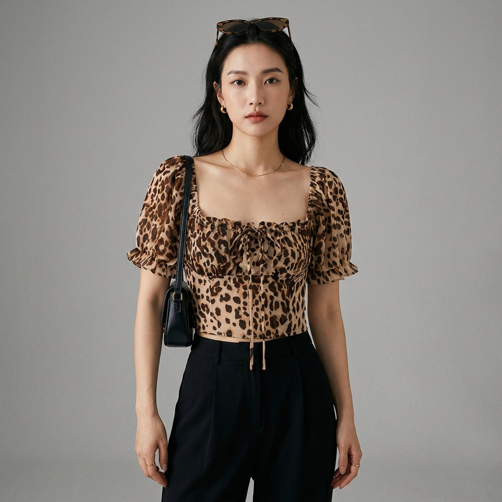 Afirme su estilo con nuestra blusa con estampado de leopardo, con mangas abullonadas versátiles y un bonito lazo. Su escote cuadrado aporta un toque de elegancia, ¡perfecto para un look moderno y atrevido! 🐆