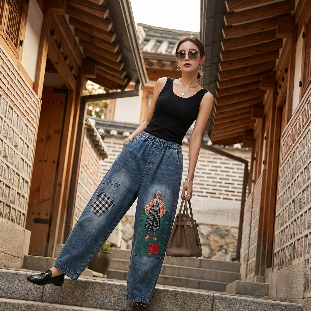- Estilo: Streetwear, Casual, K-fashion. Este pantalón encarna el estilo urbano coreano, con un toque artístico gracias a sus bordados.