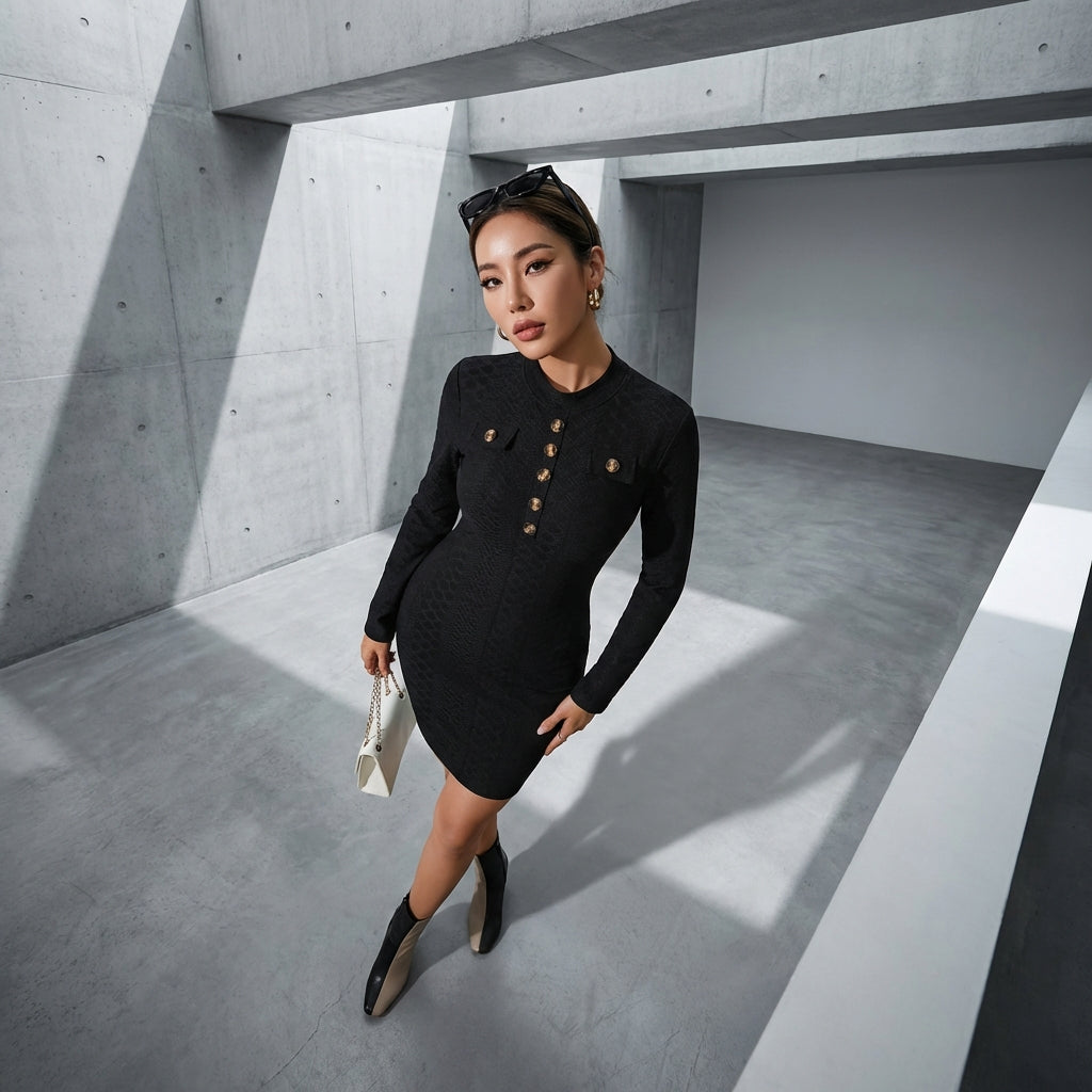 Afirme su elegancia con nuestro minivestido de cuello alto, una prenda esencial para un estilo moderno y refinado. Con sus mangas largas y detalles abotonados, este vestido ajustado es perfecto para cualquier ocasión informal, ¡ofreciéndole una silueta chic y cómoda! ✨