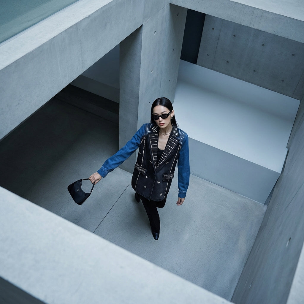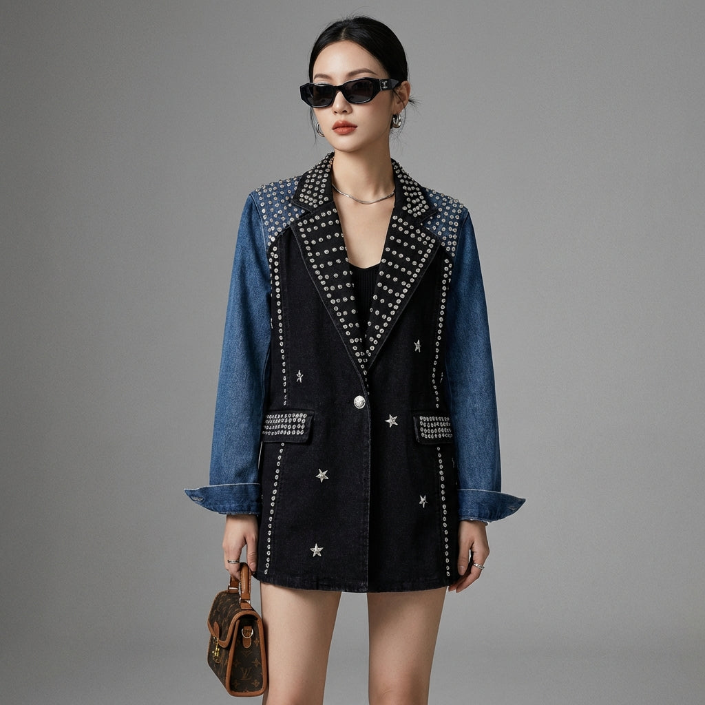 Afirma tu estilo con nuestro blazer de denim negro, realzado con remaches industriales para un toque atrevido y vintage. ¡Su corte holgado y su diseño único lo convierten en una prenda fuerte para cualquier ocasión! 🖤