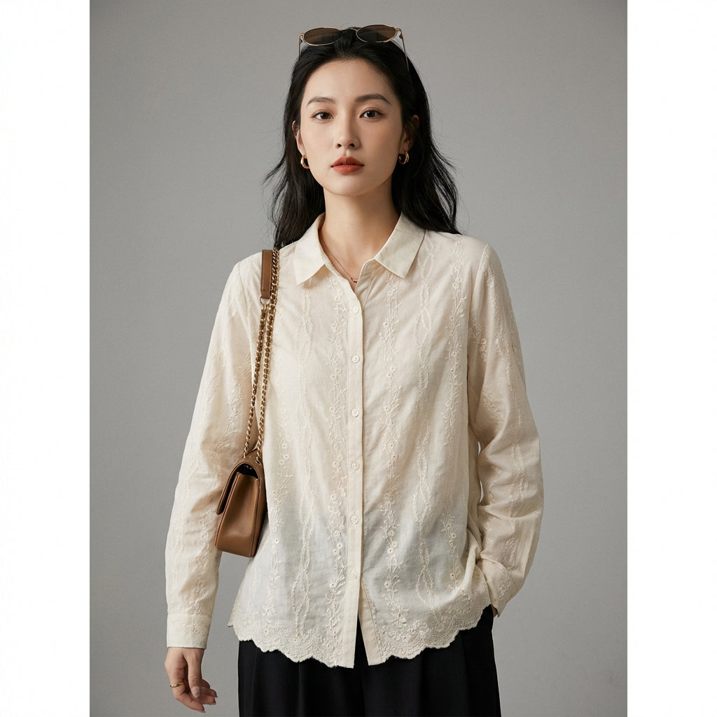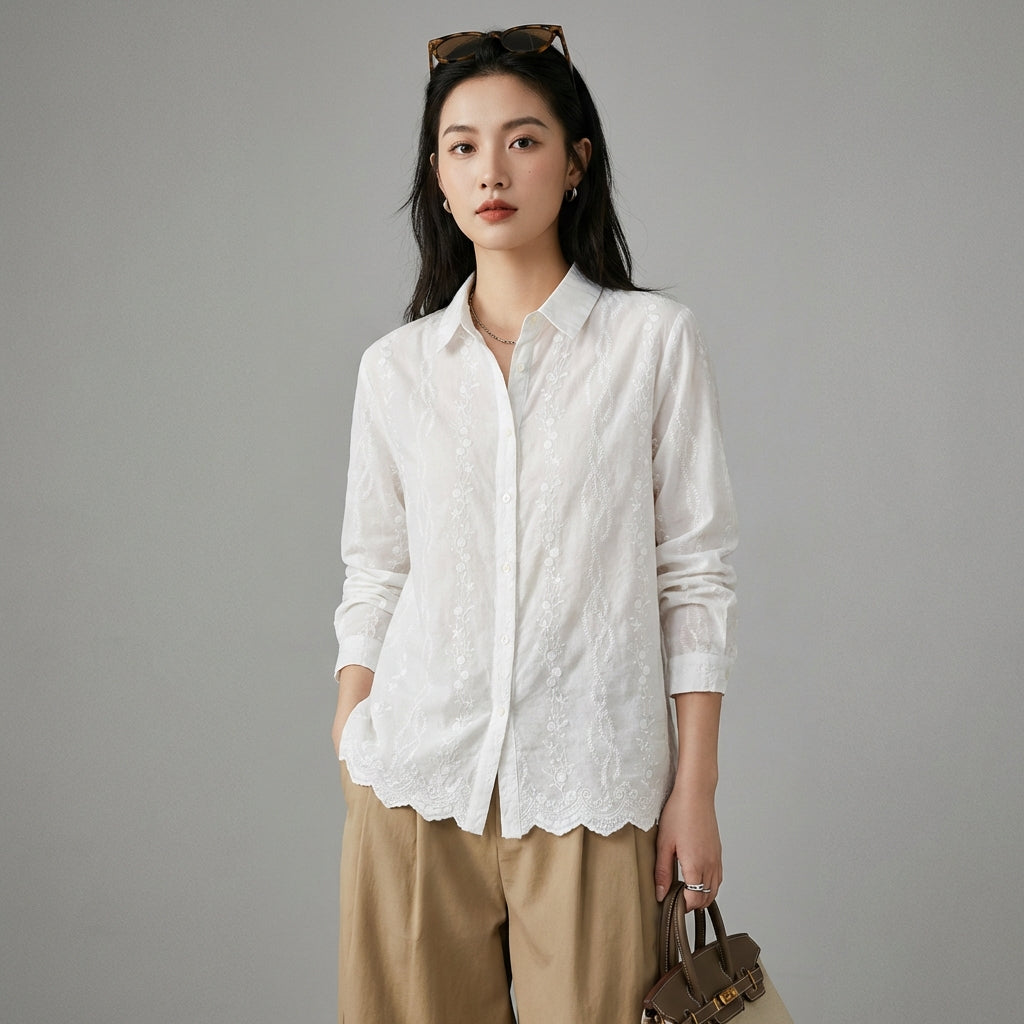 Adopta un look fresco y refinado con nuestra camisa de cuello puntiagudo, adornada con delicados bordados florales en el dobladillo. ¡Esta pieza versátil, inspirada en la moda coreana, es perfecta para un estilo casual y elegante, ideal para todas tus ocasiones! 🌸