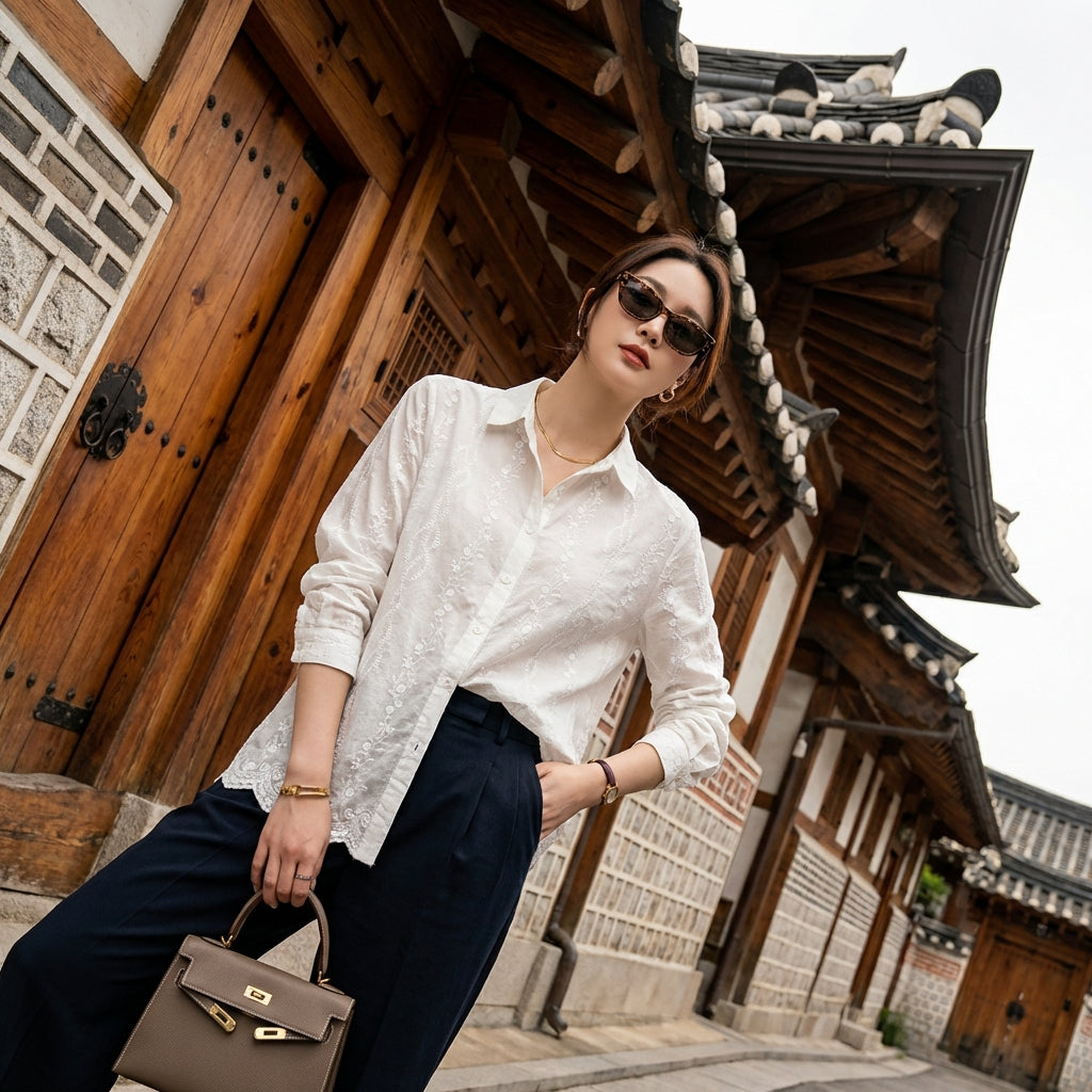 - Estilo: Moda coreana, Chic, Casual, Business Casual. Esta camisa encarna la elegancia discreta y la versatilidad de la moda coreana, perfecta para un look cuidado.