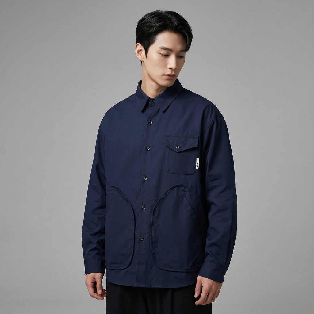 Esta camisa multi-bolsillos es un imprescindible para los hombres que buscan una prenda a la vez funcional y a la vanguardia de la moda coreana.