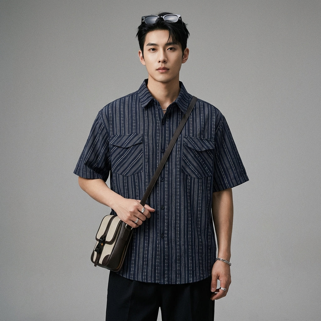 Adopta un look casual y moderno con nuestra camisa de rayas de manga corta. Su diseño holgado y sus dobles bolsillos de parche añaden un toque de estilo urbano y funcional, ¡perfecto para tus días de verano! 👕