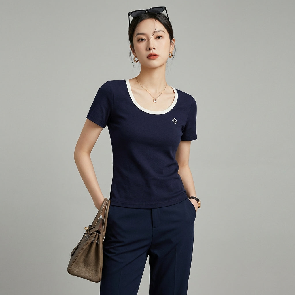 Adopta un look moderno y refinado con nuestra camiseta bordada de cuello redondo, perfecta para el verano. Su corte ajustado realzará tu figura, mientras que los bloques de color y los detalles bordados añaden un toque de originalidad. ¡Ideal para un estilo fresco y suave! ✨