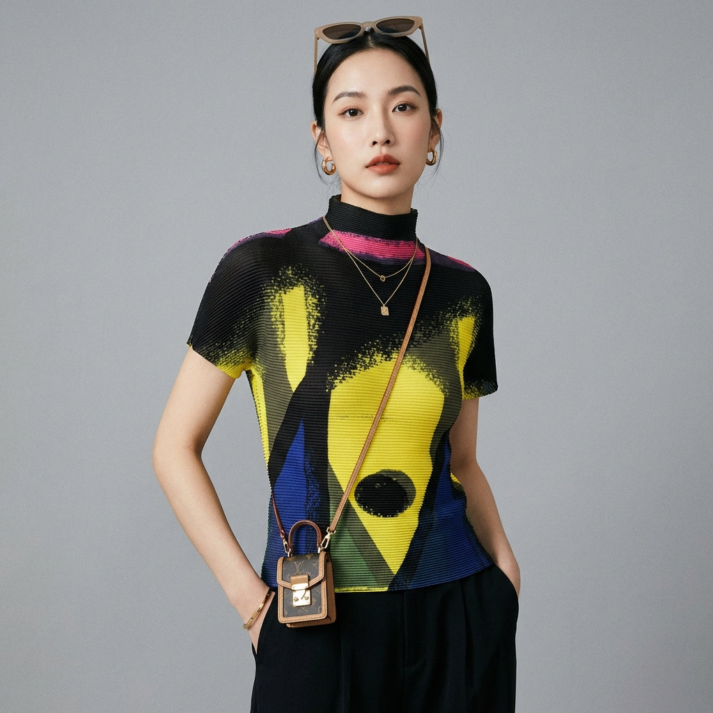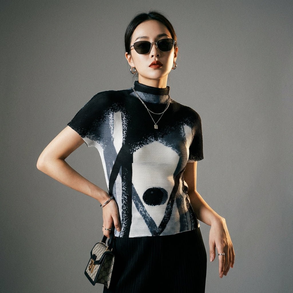 Afirma tu estilo con nuestra camiseta de cuello alto y manga corta, realzada por un atrevido estampado geométrico. Su corte ajustado realzará tu figura, ¡perfecta para un look veraniego y a la moda! ☀️