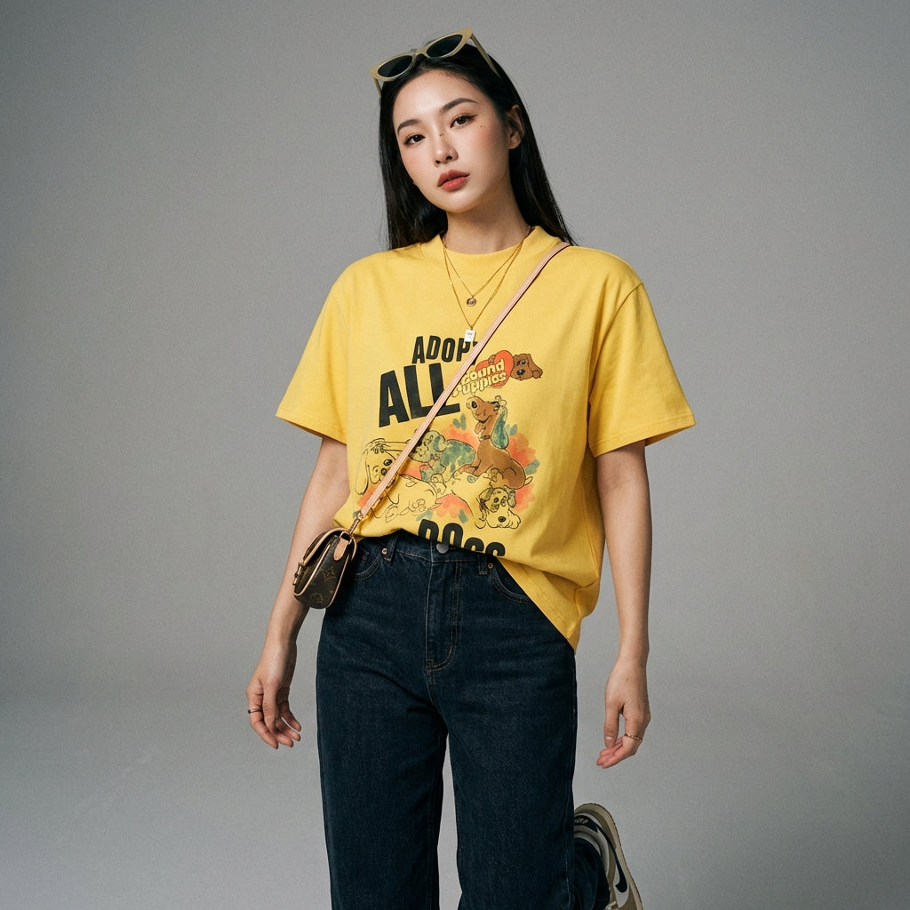 - Estilo: Streetwear, K-fashion, Retro Japonés. Esta camiseta encarna el espíritu casual y moderno de la moda urbana, con una inspiración retro japonesa y un guiño a la K-fashion.