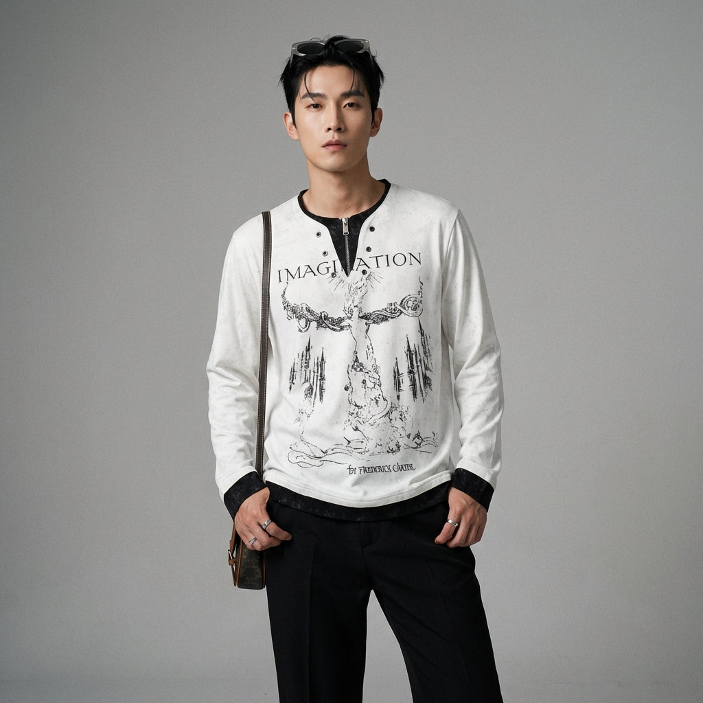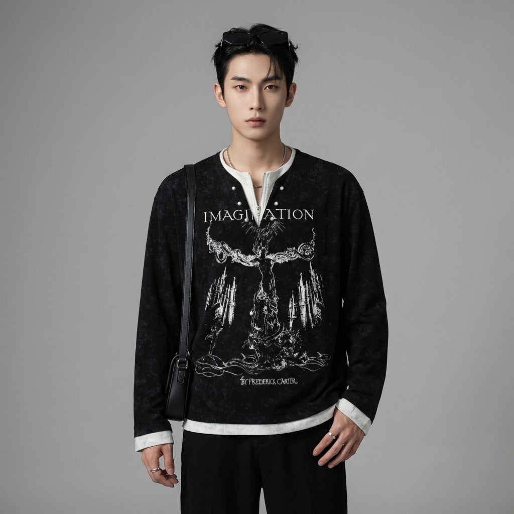 Afirma tu estilo con esta camiseta de manga larga de diseño único, que combina un estampado abstracto y detalles de botones nacarados para un sutil efecto de "dos piezas". ¡Ideal para un look streetwear atrevido y cómodo! ✨